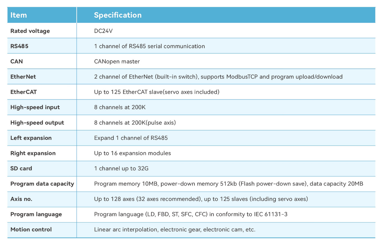 EtherCAT includes both real and virtual axes and supports a maximum of 128 axes (32 axes recommended) and 16-axis electronic cam with synchronization cycle of 2ms.