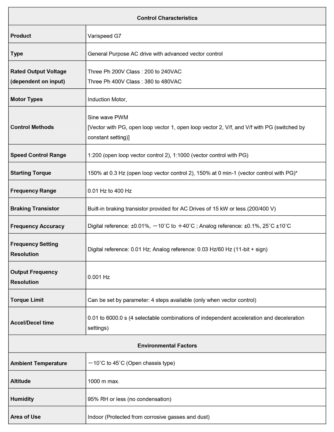This G7 (480V) allows motor operation at very long cable lengths, with peak voltage being 30% less than conventional drives. Motor bearing current is 50% less than standard drives, providing four times the bearing life. Audible motor noise is 20% less.